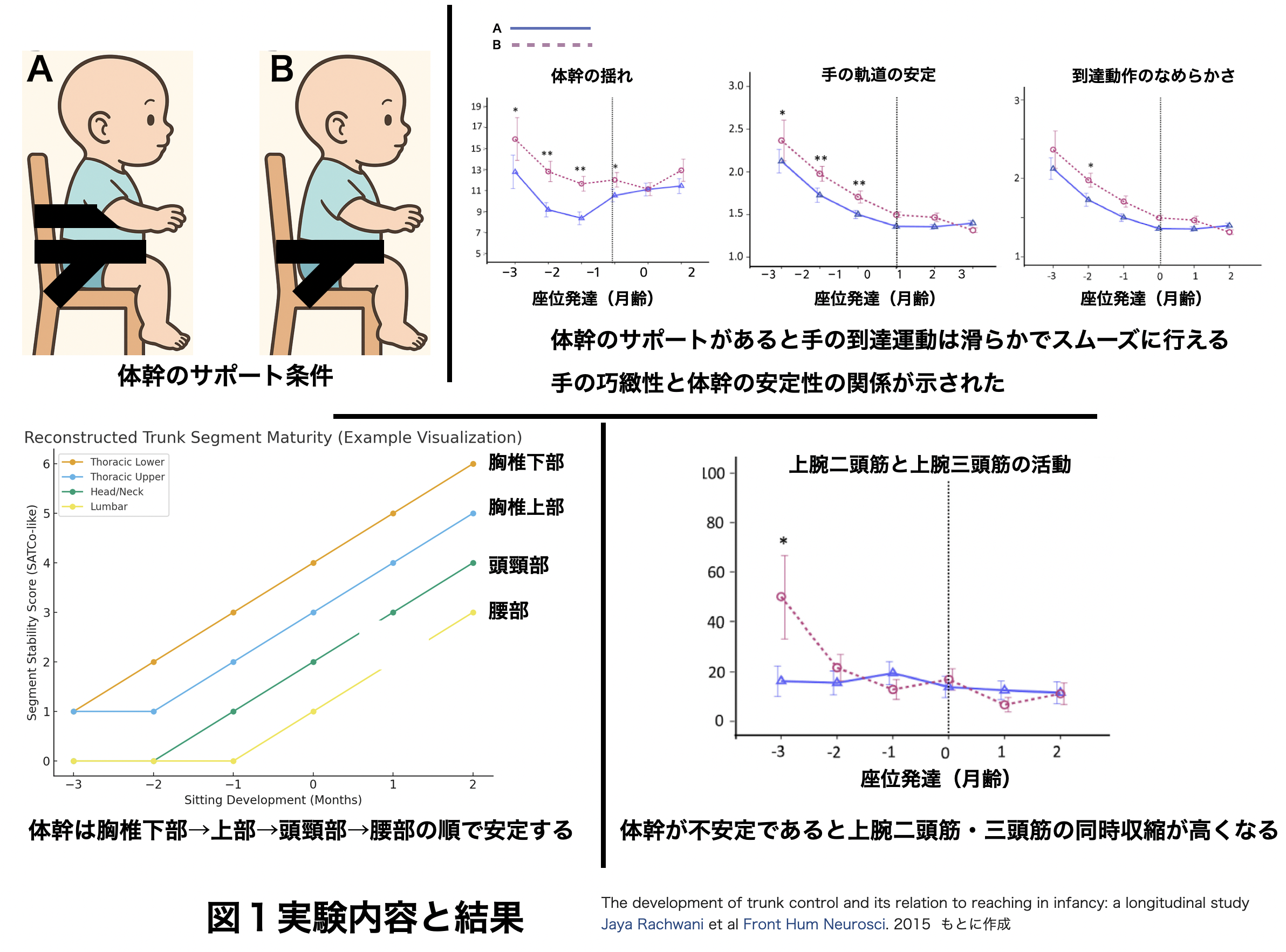 この論文は、生後3ヶ月から7ヶ月の乳児を対象に、座る姿勢の安定性が、どのように手を伸ばす動作に影響するかを調べています。