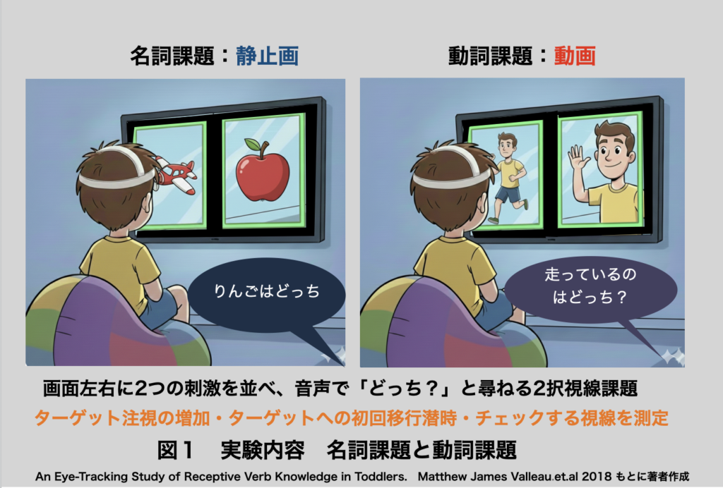 本研究では、22〜24か月の幼児に、画面の左右へ2つの刺激を提示し、音声で「走ってるのはどっち?」のように問いかけました。名詞では静止画を、動詞では動画を用い、質問の前後でどちらを見る割合が変化するかを測定しています(図1参照)。
