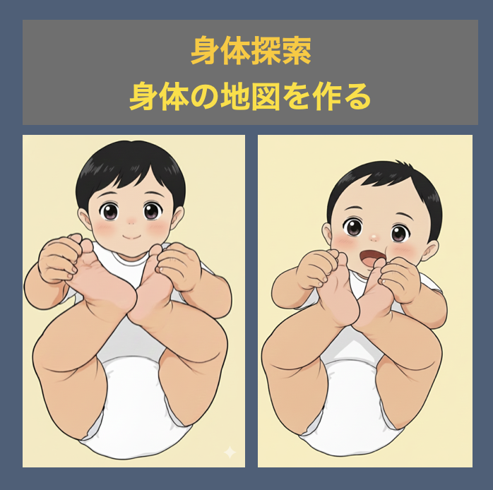 こうした行動は、自分で自分の体を触ることで身体の地図を育て、外界のものを操作する準備をしているようです。